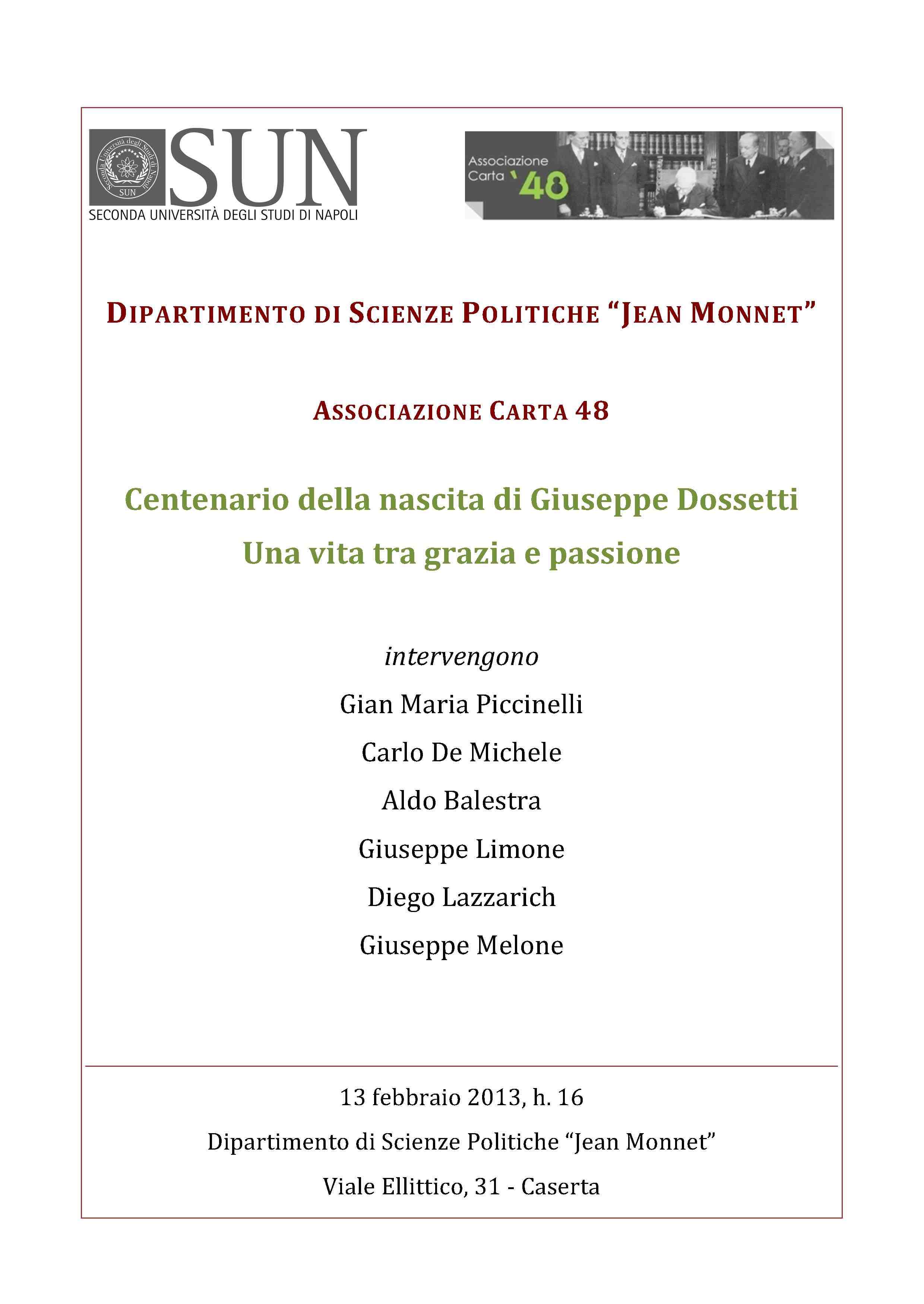 In occasione del centenario della nascita di Giuseppe Dossetti, si terrà un incontro per ricordare il pensatore politico.Interverranno:Gian Maria PiccinelliCarlo De MicheleGiuseppe LimoneDiego LazzarichGiuseppe Melone