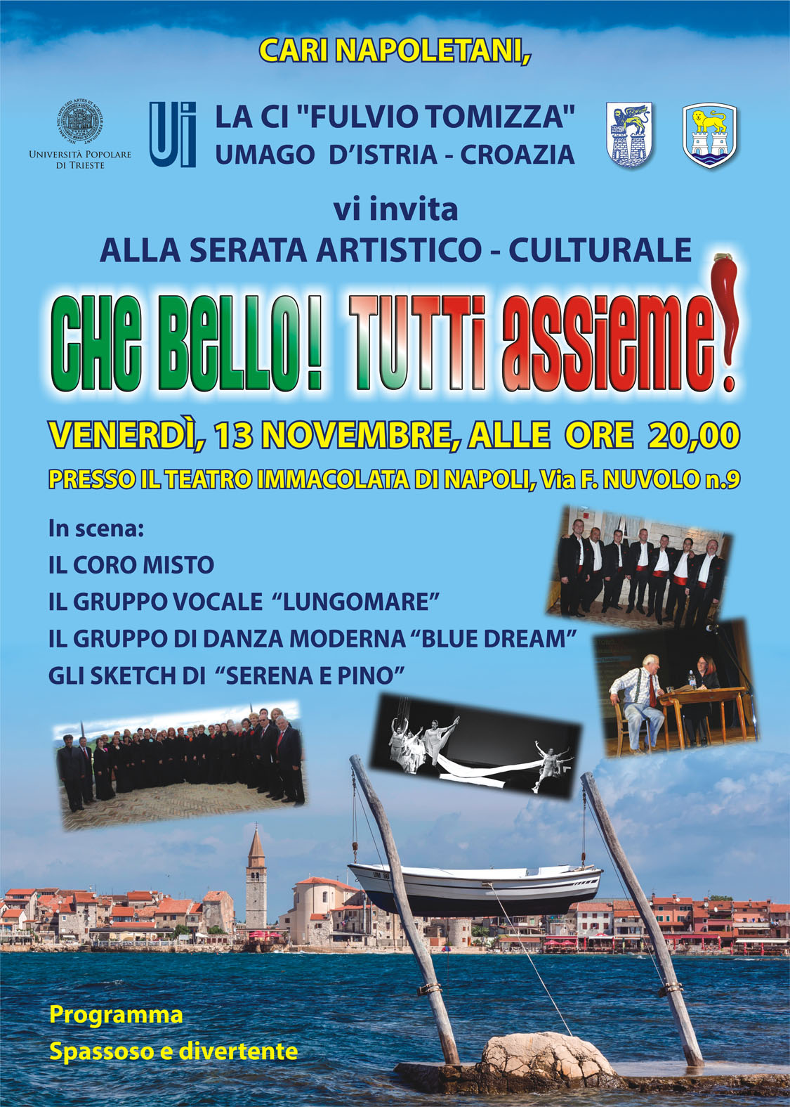 Venerdì 13 novembre 2015, h. 20 al Teatro Immacolata (Via F. Nuvolo, 9) si terrà la serata artistico-culturale della comunità di Umago intitolato