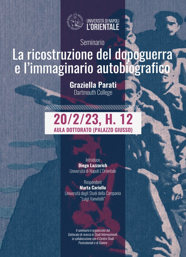 Lunedì 20 febbraio 2023, h. 12, Graziella Parati (Dartmouth College) terrà un seminario sul ruolo giocato dalla scrittura autobiografica nel processo di “nation building” italiano del Secondo dopoguerra. Il seminario mostrerà come la scrittura autobiografica sia servita per criticare, e allo stesso tempo rivalidare, l’aderenza al fascismo del Ventennio, contribuendo alla sopravvivenza del fascismo nell’Italia repubblicana.
