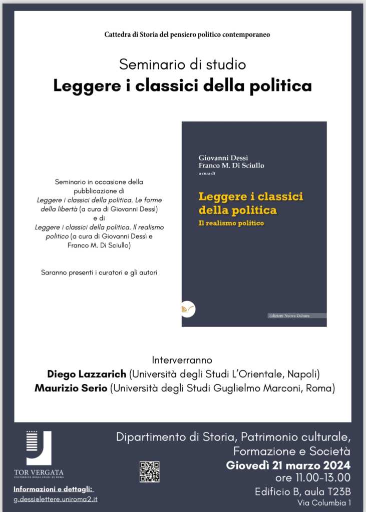 Seminario in occasione della pubblicazione di Leggere i classici della politica. Le forme della libertà (a cura di Giovanni Dessi) e di Leggere i classici della politica. Il realismo politico (a cura di Giovanni Dessì e Franco M. Di Sciullo).