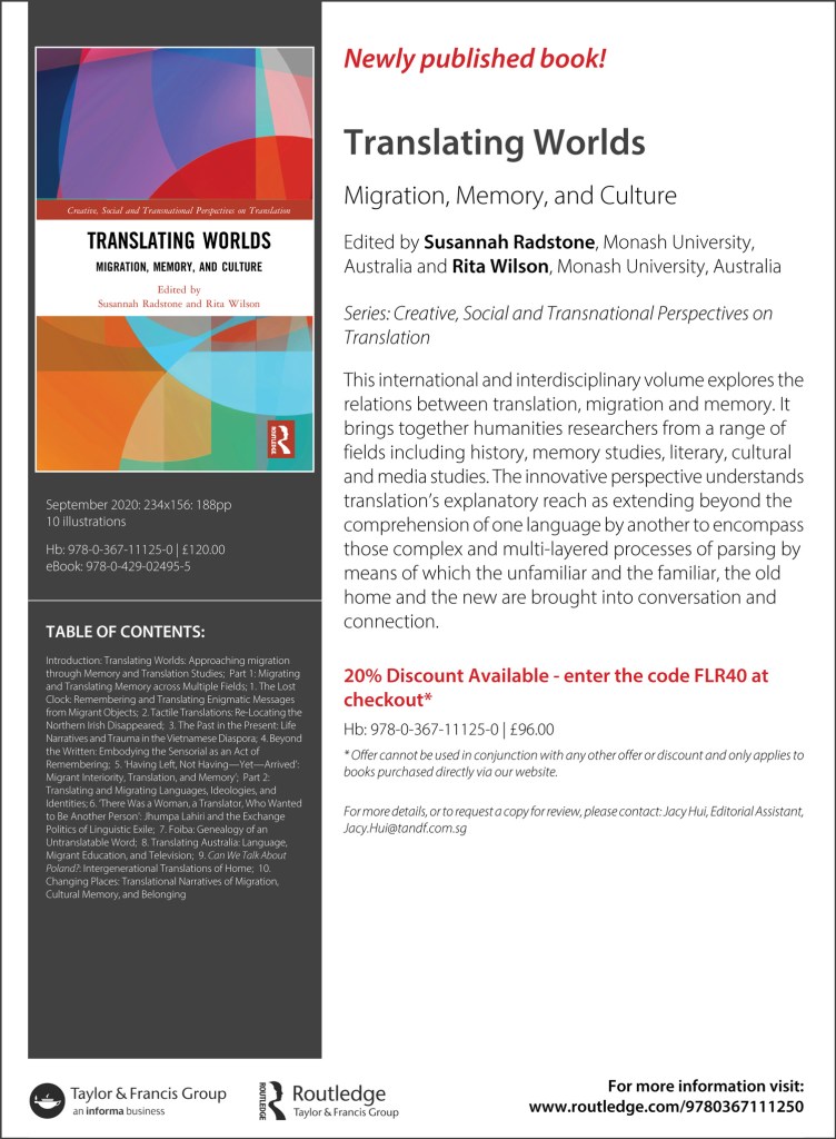 Il link alla pagina web della Routledge: https://www.routledge.com/Translating-Worlds-Migration-Memory-and-Culture/Radstone-Wilson/p/book/9780367111250