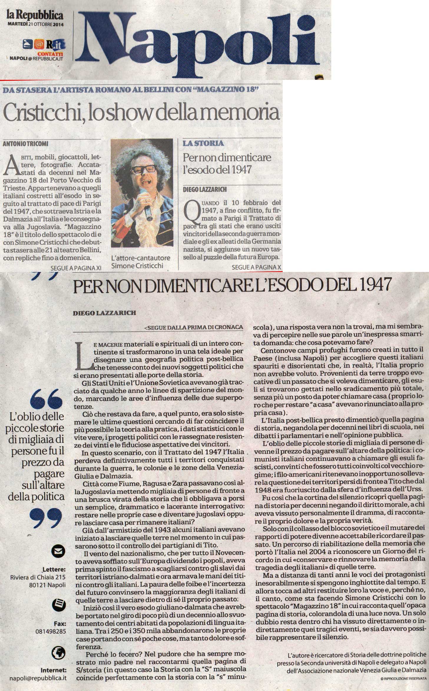 Oggi, 24/20/2014, su “Il Mattino” (Caserta) un articolo di Maria Teresa Rossi intitolato “Il «magazzino 18» di Cristicchi: l’esilio dimenticato” in cui si racconta l’incontro con Cristicchi avuto ieri al Dipartimento di Scienze Politiche “Jean Monnet” della Seconda Università degli Studi di Napoli.