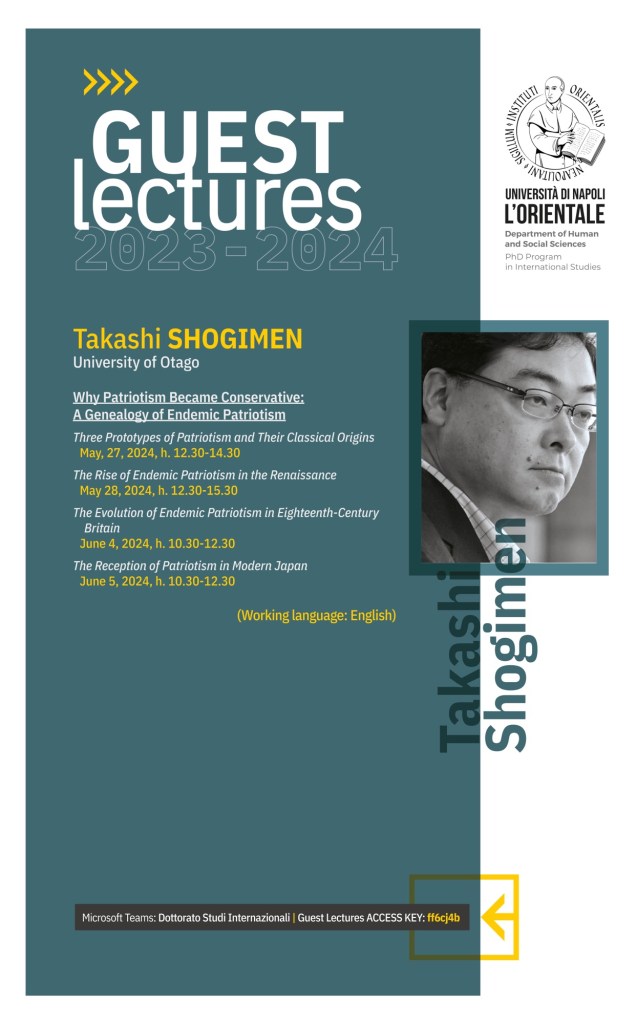 Sono molto contento di ospitare il prof. Takashi Shogimen (University of Otago) all’Università degli Studi di Napoli “L’Orientale”, dove terrà un ciclo di seminari per il dottorato di ricerca in Studi internazionali.